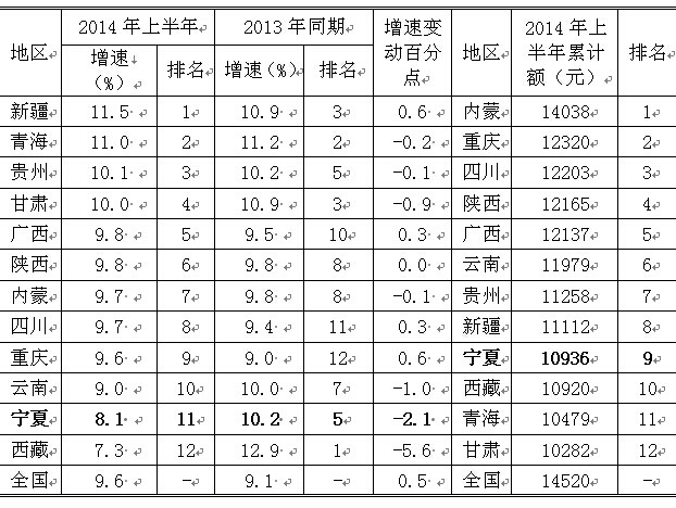2014年上半年西部地区农村常住居民人均可支配收入对比表