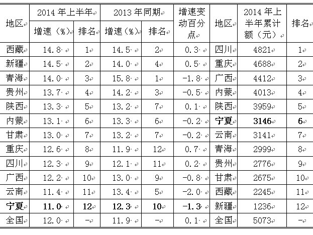 宁夏上半年农村居民人均可支配收入为3146元,增速为11%,位列西部地区末位,绝对值的排名则稍微靠前一点,以人均3146元位列西部地区第6位。