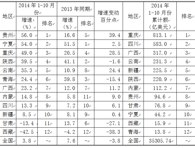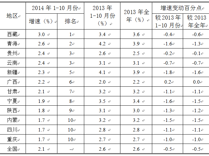 从同比增速来看,2014年1-10月份,西部地区有6个省区保持了两位数增长,有7个省增速高于全国平均水平9.8%,宁夏、陕西、四川、内蒙和云南的增速低于全国平均增速。
