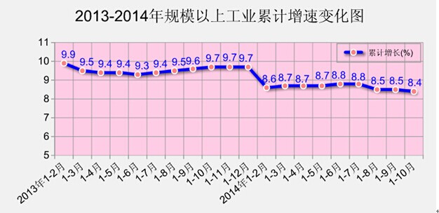 2014年1-10月份,规模以上工业增加值同比实际增长8.4%。增速较1-9月份小幅回落0.1个百分点,比上年同期回落1.3个百分点。