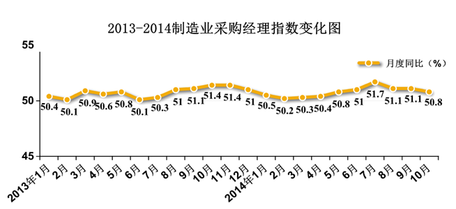2014年10月,中国制造业采购经理指数(PMI)为50.8%,较9月份小幅回落0.3个百分点,但仍高于临界点,表明我国制造业总体上继续保持平稳增长态势。