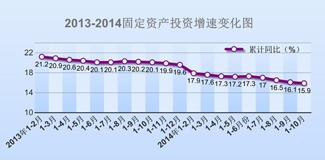 2014年1-10月份,全国固定资产投资(不含农户)406161亿元,同比名义增长15.9%,增速比1-9月份回落0.2个百分点,比去年同期回落4.2个百分点。从环比速度看,10月份固定资产投资(不含农户)增长1.64%。