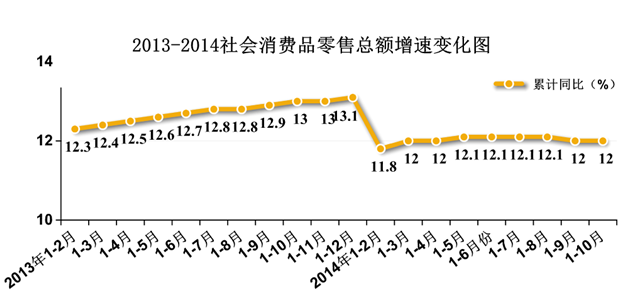 2014年1-10月份,社会消费品零售总额213118亿元,同比增长12.0%,增速与1-9月份持平,较上年同期回落1.0个百分点。其中,限额以上单位网上零售额3307亿元,增长55.6%。