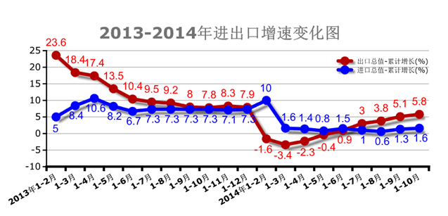 2014年1-10月,我国进出口总值3.53万亿美元,增长3.8%,增速较1-9月份加快0.5个百分点。其中,出口1.90万亿美元,增长5.8%,较1-9月份加快0.7个百分点;进口1.63万亿美元,增长1.6%,较1-9月份加快0.3个百分点;贸易顺差2771亿美元。
