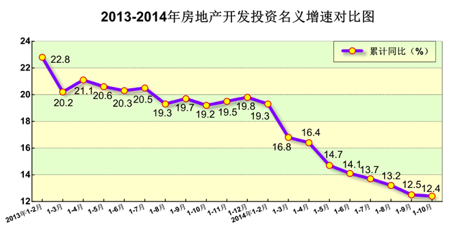 2014年1-10月份,全国房地产开发投资77220亿元,同比名义增长12.4%,增速比1-9月份回落0.1个百分点,是2014年以来的最小降幅。其中,住宅投资52464亿元,占房地产开发投资的比重为67.9%,住宅投资同比增长11.1%,增速回落0.2个百分点。