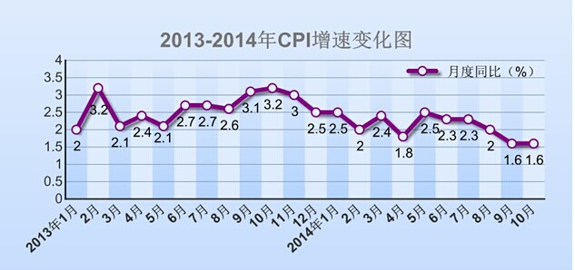 2014年10月份,全国居民消费价格总水平同比上涨1.6%。其中,城市上涨1.7%,农村上涨1.4%;食品价格上涨2.5%,非食品价格上涨1.2%;消费品价格上涨1.4%,服务价格上涨2.0%。1-10月平均,全国居民消费价格总水平比去年同期上涨2.1%。